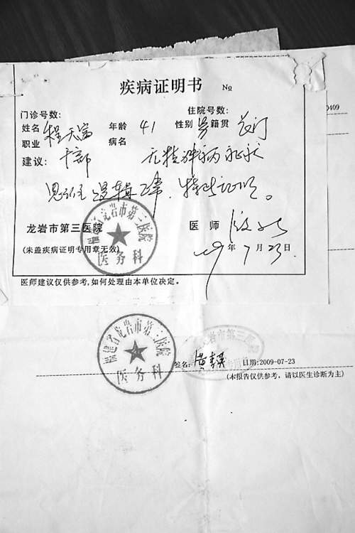 2009年7月18日,程天富從精神病院第四次出來,擔(dān)心呆在長汀還有被抓進(jìn)精神病院的危險,但又無法證明自己沒有精神病,遂到龍巖的醫(yī)院就診。