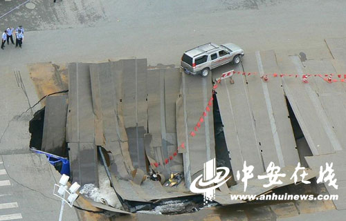 中新網合肥8月8日電(成展鵬 李君)今天中午一點二十分左右,安徽省合肥市長江中路與徽州大道交叉口發(fā)生路面塌陷,塌方面積約半個籃球場大,有一輛汽車傾斜在塌陷洞旁的鋼板上。
