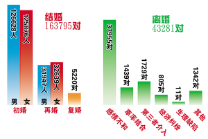 新人笑,離人哭,每個(gè)婚姻登記處每一天都在上演不同的悲歡離合。2009年已經(jīng)過了一半,半年來,有163795對(duì)新人走進(jìn)婚姻殿堂,又有43281對(duì)夫妻分道揚(yáng)鑣。昨日,本報(bào)邀婚姻專家剖析這半年的婚姻現(xiàn)象,并為不同年齡不同婚齡讀者支招。