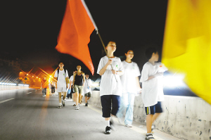 8月8日凌晨4點,白天喧囂的洋人街一片靜悄悄。數十名男女身穿統(tǒng)一的T恤,手拿礦泉水瓶,堅定地朝前走。頭天深夜從大禮堂出發(fā),沿兩路口、長江大橋,到南濱路、彈子石洋人街,他們已走了一個通宵。