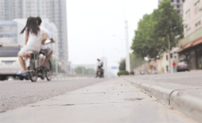提起這段路,家住桐淮小區(qū)的陳大爺有話要說:“我們在樹下乘涼時,經(jīng)?吹接腥怂さ,摔得都可厲害!薄皞z月來,幾乎每天都會看到有人摔倒。騎自行車、電動車的都有!币慌缘耐醢⒁炭烊丝煺Z。她說,主要是路面高度問題,再加上市民騎車時并沒注意到這個臺階,才導(dǎo)致前車輪上不來,車倒人傷!扒疤煲粋女的騎電動車,還帶著孩子呢,上臺階時,大人和孩子一起摔下來。車摔壞了,車身上的塑料板碎了一地。人也站不起來,打電話喊來家人用面包車送到醫(yī)院!