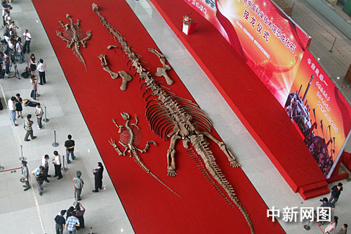 中新網(wǎng)北京8月18日電 (記者 孫自法)三具侏羅紀(jì)時(shí)期的恐龍化石,十八日下午在它們的“新家”——中國(guó)科學(xué)技術(shù)館新館揭開“紅蓋頭”,正式由云南省楚雄彝族自治州“嫁”入北京落戶中國(guó)科技館新館,并將于下月中旬新館開放后進(jìn)行永久性展出。