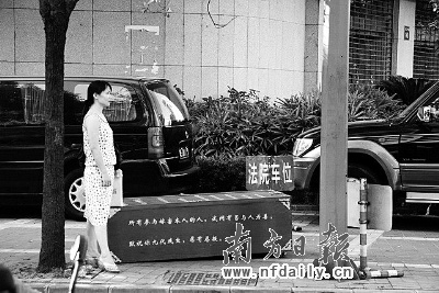 昨日上午8時(shí)許,車水馬龍的佛山市禪城區(qū)法院門(mén)口赫然驚現(xiàn)一副棺材,棺材上還有辱罵法官的文字,引來(lái)不少群眾圍觀。