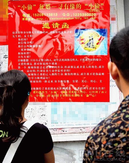 昨(25)日,沙灣路128號(hào)小區(qū)門口的告示欄里貼出一張大紅色的“邀請(qǐng)函”:“小偷征婚,征有緣小偷,共度七夕”、“小偷征小偷,生個(gè)小小偷!闭(dāng)圍觀者面露鄙夷時(shí),有眼尖的市民發(fā)現(xiàn),此“小偷”非竊取錢財(cái)之輩,“別人是偷心的賊!