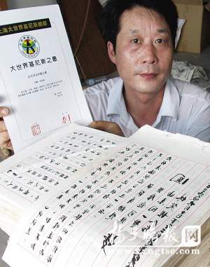 高淳縣椏溪鎮(zhèn)荊山村農(nóng)民張正福,利用6年時(shí)間反字倒抄紅樓夢(mèng)全集,共120回,86萬(wàn)字,并順利獲得大世界基尼斯之最證書(shū)(如左圖)。為了給附近村民修建一條長(zhǎng)約一千米的水泥路,他決定將這些手抄本賣給有收藏條件的愛(ài)好者。