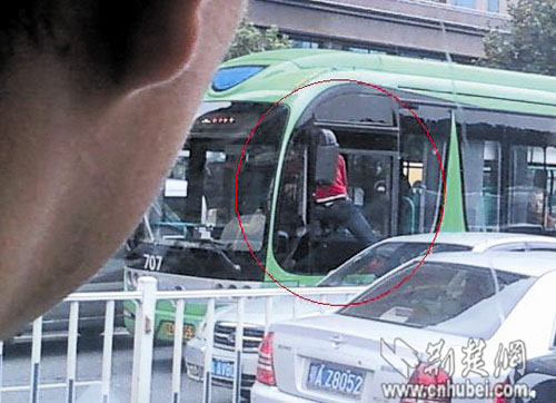 一名網(wǎng)友拍到了整個過程,并發(fā)到了網(wǎng)上,圖片顯示:一名穿紅色上衣的男子腳踩在一輛銀色轎車上,上半身鉆進(jìn)公汽的駕駛室里,毆打公汽司機(jī)。該網(wǎng)友稱,被打的是707路公汽司機(jī),公汽司機(jī)一直沒還手。