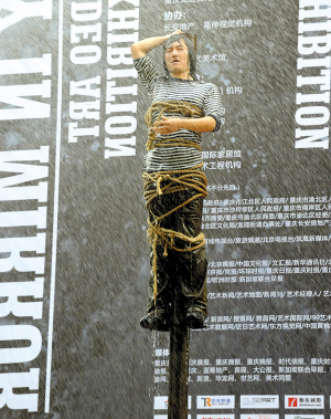37攝氏度的高溫下,26歲的王軍被綁在近10米高的柱子上,先是被酷熱“折磨”了半小時,后又被環(huán)衛(wèi)車的水龍頭沖淋了半小時,耗費了8噸自來水,總共耗時兩小時。這個名為《守望》的行為藝術作品昨天下午在黃桷坪102藝術區(qū)雷倒了不少人!