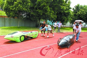 歷經(jīng)暑假兩個多月打造,外形如一顆黑色子彈、25毫升汽油可跑8000米的概念車“子彈頭”驚艷亮相,近日在華農(nóng)大操場進行了性能測試。這輛車的制作團隊主要由30多名大三大四學生組成,從制作配件到設計安裝全部手工完成。該車全長3.2米,高70厘米,重約20公斤,由一人駕駛,時速可達40~50公里,本月下旬將赴上海參加一項節(jié)能車競技大賽。