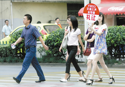 盡管這時的交通還有些繁忙,但過往的司機們看到這么熱情的美女,大多很自覺地在斑馬線前剎住了車,行人們則從容地過起了馬路。