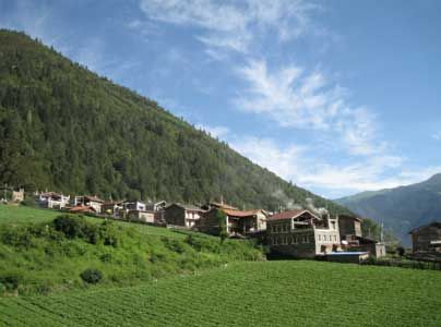 這就是“白菜公主”居住的砍竹村上寨,藍天、森林、草場、白菜地、石砌藏房,真是世外桃園。該村距317國道僅兩公里,有路況較好的通村公路連接國道,是自駕游理想的目的地。