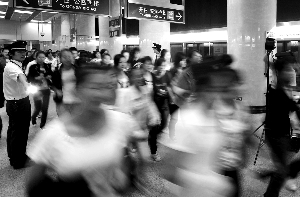 4號線西直門站里突然斷電,應(yīng)急照明隨即開啟,200多名“乘客”在工作人員的引導(dǎo)下,向2號線、13號線通道疏散。前夜,4號線進(jìn)行首次疏散演練,兩大運(yùn)營商首次演練了緊急情況下的配合機(jī)制。