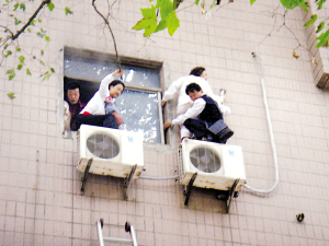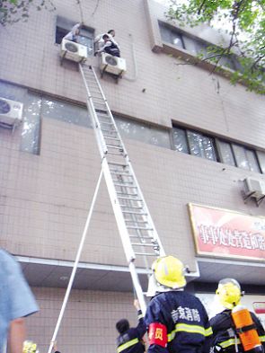 在發(fā)現(xiàn)大樓失火后,商務(wù)樓內(nèi)的物管立即報警求助。2點34分,消防人員、交警和120急救車趕到現(xiàn)場。在商務(wù)樓的西側(cè)兩個窗戶處,有幾位被困在樓內(nèi)的市民被濃煙嗆得站在窗口外呼救,由于煙霧太大,他們不得不爬出窗外,站在墻外的空調(diào)外機上等待救援。無法站立的這幾位市民一邊用手扶著寫字樓的外墻,兩只腳站在空調(diào)外機上,這一幕無不讓現(xiàn)場圍觀的群眾為他們捏了一把汗。等到消防隊員趕到現(xiàn)場之后,立即呼喊他們不要緊張,不要向下跳,在現(xiàn)場架設(shè)了云梯進(jìn)行救援并成功地將四名被困市民解救了下來。
