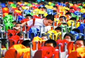 在二十七中和奮斗小學(xué)的表演團(tuán)隊(duì)都有替補(bǔ)隊(duì)員。“哪個(gè)坐標(biāo)點(diǎn)缺人了,他們就會(huì)立刻補(bǔ)上去,所以說(shuō)他們要組的字和圖案比較多,可以說(shuō)每一個(gè)動(dòng)作都要會(huì)!边@些替補(bǔ)隊(duì)員在不上場(chǎng)的時(shí)候,還要在隊(duì)列之間進(jìn)行巡視,查看道具,提醒同學(xué)做動(dòng)作。另外修道具也是他們的一項(xiàng)重要工作,為此表演的同學(xué)們都叫這些替補(bǔ)隊(duì)員為“小師傅”。
