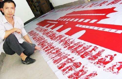 二十四日,記者看到,該剪紙長(zhǎng)約十米,寬兩米,以紅白兩色為主,線條活潑流暢,人物形態(tài)逼真。剪紙上方為“熱烈慶祝中華人民共和國(guó)成立六十周年”十七個(gè)大字;中間接紅色天安門(mén)城樓,顯得巍峨壯觀;再往下是天安門(mén)廣場(chǎng),五十六個(gè)民族的代表分兩行排列,身著獨(dú)具民族特色的服飾,或歡歌或舞蹈,五十六個(gè)民族團(tuán)結(jié)一致、喜迎國(guó)慶之情躍然于紙上。