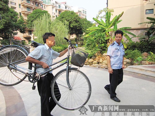 9月26日下午,一名小偷在(廣西)南寧市大學(xué)路嘉慧馨源小區(qū)偷得一輛自行車(chē),準(zhǔn)備推車(chē)離開(kāi)時(shí),卻遇到了車(chē)主——該小區(qū)的一名保安。車(chē)主抓住小偷后,讓其扛車(chē)在小區(qū)示眾。