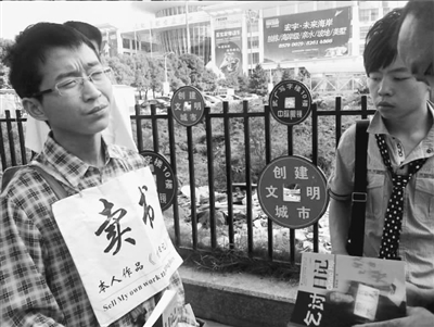 夏海波身著藍(lán)格上衣,鼻梁架一副眼鏡,手舉賣書招牌,兩眼呆呆地望著前方,正是他在網(wǎng)上掛出的招牌“苦相”。有人看到他時(shí)不禁驚叫:“哇!他就是網(wǎng)上說(shuō)的‘史上最牛乞丐’夏海波”!八诰W(wǎng)上火得很!”