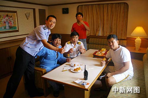 “趕快讓大家都過來,有月餅吃。”船長告訴助手,十幾個(gè)船員陸陸續(xù)續(xù)來到船長辦公室,狹小的船艙一下子熱鬧起來!癎ive me one.”(給我一塊。)“It’s delicious.”(真好吃。)