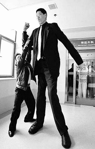 今年27歲的趙亮是濮陽南樂縣梁村鄉(xiāng)西崇町村人,身高2.46米,這一高度比姚明高20厘米、比曾有“世界第一巨人”之稱的鮑喜順還高出10厘米,是名副其實的“第一高人”。趙亮16歲時身高就已達到1.90米,17歲時被推薦到河南省體校籃球隊,在一次扣籃時左腳扭傷,一直未能痊愈。今年4月,天津一家醫(yī)院免費為趙亮進行了腳傷手術(shù)。不久,成為媒體關(guān)注焦點的趙亮被歐寶地板聘請,成為公司一名管理人員。上班后,趙亮作為企業(yè)形象大使備受社會關(guān)注。