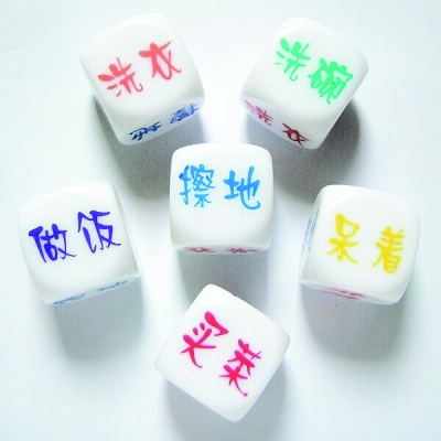 昨日,記者在沙坪壩女人街一家飾品店找到了這種骰子,骰子是用塑料制成的,和普通骰子的大小無異,“這種骰子銷路很好,一般都是女孩子買”,店主李于婷說,這種5元錢一個的骰子深得80后女子喜歡,她笑著告訴記者,曾有一名女孩非常興奮地買下一個,握到骰子的那一刻便說,將如何運(yùn)用這個骰子,讓家務(wù)活全部轉(zhuǎn)到老公手中去。