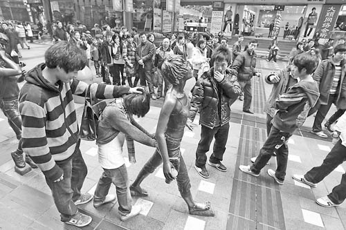 北京女孩清越去年6月28日參加了一次“定格”:大家隨意在路上走,一個(gè)信號(hào)發(fā)出來,參加活動(dòng)的人就保持不動(dòng),持續(xù)3~5分鐘。“我們想和周圍的行人形成動(dòng)靜的對(duì)比,純粹就是好玩!眳⑴c者全從網(wǎng)上召集,活動(dòng)那天來了將近200人。