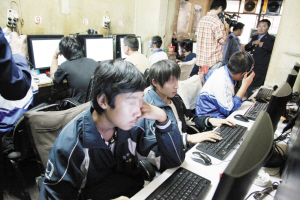 中午11點半左右,網(wǎng)吧涌進十幾個穿著八十九中校服的學生,孩子們很熟悉地朝胖女子打著招呼,喊了聲“姑姑,開機”,胖女子便忙活著收過錢后,一一為孩子們開機。由于機器有限,沒爭到電腦的學生只能站在后面一邊看,一邊搭話聊天,不舍得離開。記者看到,為了趕時間,很多孩子都著帶盒飯,邊吃邊玩。有些沒有帶盒飯的孩子,一邊緊張地打著游戲,一邊叫胖女子泡一碗方便面,匆匆吃幾口,又開始進入游戲中。下午4點20分左右,身穿校服的孩子們再次大量涌入,為了不被家長發(fā)現(xiàn),有些孩子甚至將自行車搬進了網(wǎng)吧。
