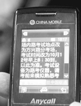 “場地考試點改為方興路分考場,請于10月1日至8日早上8:30到考場進行場內路模擬,合格后方可參加考試!眹鴳c節(jié)前夕,很多參加駕駛證直考的考生收到了這樣一條短信,短信后附有考試地址和聯(lián)系電話。