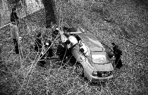 車后方坐著一名長發(fā)女子,滿臉是血,不時發(fā)出呻吟。另一名紅發(fā)男子倒在女子腳邊,一臉血跡。由于事發(fā)地點偏僻,現(xiàn)場并沒有目擊者。警燈閃爍,可以看到被撞的柳樹下方有一個約15厘米深的凹槽。