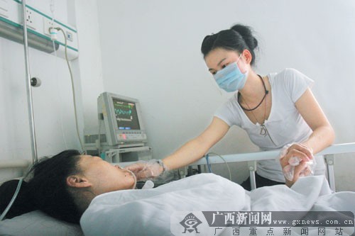 11月8日中午,記者根據(jù)帖子上所留的手機(jī)號碼聯(lián)系上了楊霏!敖憬,你睜開眼睛看看我啊,睜大一點(diǎn),乖,就是這樣!”當(dāng)天12時30分,在廣西醫(yī)科大一附院神經(jīng)內(nèi)科一病區(qū)7樓的病房,楊霏和剛進(jìn)食完的姐姐在說話。楊霏的大姐楊耀仙躺在病床上,鼻口插著氧氣管,整個身體干瘦得只剩下皮包骨頭,神志也是迷糊不清。楊耀仙現(xiàn)在不能自行進(jìn)食,只能靠親人從連接在身體上的幾條塑料管注射一些醫(yī)院配制的流體食物維持生命。而楊霏也不時拿起姐姐的手和腳做一些物理按摩!拔医憬氵@兩天病情有所變重了。”見到記者,她給姐姐蓋好被子,示意到樓梯口說話。