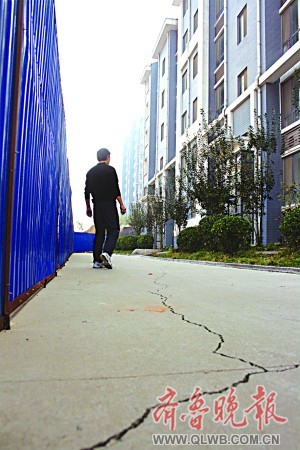 在施工工地的影響下,10號樓北側(cè)路面中央,一條長約10米、寬近1厘米的裂縫清晰可見。3單元樓道口門內(nèi)側(cè),也出現(xiàn)了一道明顯的裂縫,就因為這道裂縫,樓道門曾一度無法閉嚴。“你來看,樓外也有一圈裂縫!庇浾咴谝幻糁敢,看到一樓外墻與地面接合處裂開了一條很寬的縫隙,最寬處有兩厘米。