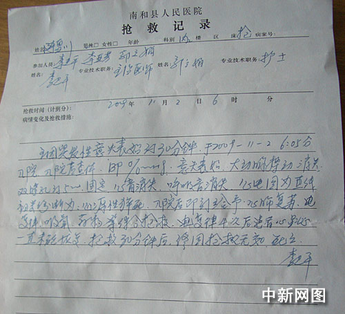 記者在南和縣人民醫(yī)院見到陳雪川的“搶救記錄”,記錄顯示:主因突發(fā)性意識喪失約30分鐘,于2009年11月2日6時05分入院,入院查體,意識喪失,大動脈搏動消失,雙瞳孔約5mm,固定,心音消失,呼吸音消失,心電圖為直線,初步診斷為心源性猝死,入院后給予綜合搶救,電復(fù)率4次后患者心跳一直未能恢復(fù),搶救30分鐘后,終因搶救無效,死亡。
