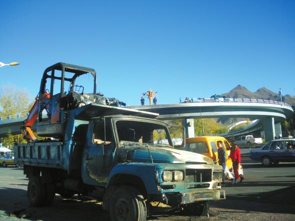 記者在事故現(xiàn)場看到,一輛被燒成空架的東風(fēng)車及被燒過的裝載機放置在路邊,立交橋的欄桿已被撞出一個寬大的口子,橋下3柱景觀路燈也被燒壞。橋下地面還殘留著大片油漬,旁邊被大火殃及的工商部門辦公樓燒毀嚴(yán)重。清理現(xiàn)場的工作人員正在對一些危險建筑物進行拆除,并對現(xiàn)場油污進行清理。