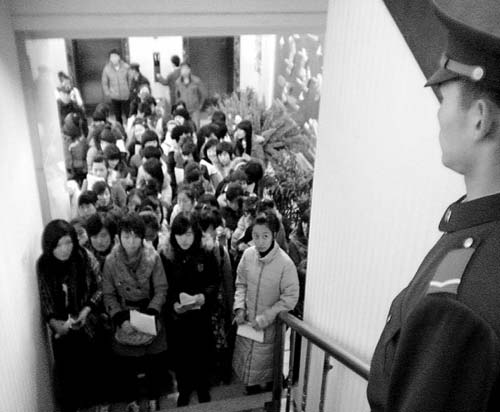 當(dāng)記者進(jìn)入鴻翔賓館一樓大廳時(shí),前來報(bào)名的女孩和家長們將這里擠得水泄不通。在賓館二樓,沈陽警備區(qū)的工作人員正在做著準(zhǔn)備工作!皥(bào)名開始后,我們將進(jìn)行分類,在校大學(xué)生將走一個(gè)門報(bào)名,應(yīng)屆畢業(yè)生將走另一個(gè)門。”