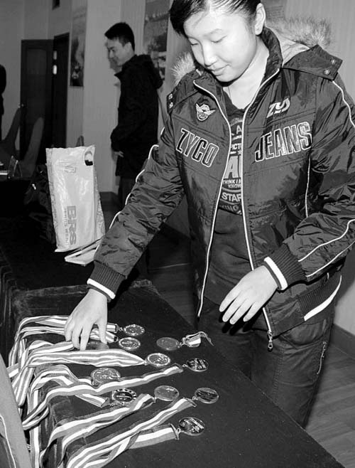 這位叫曹莉燁的女孩告訴記者,自己7歲習(xí)武,畢業(yè)后一直參加集訓(xùn)和比賽,因此才在畢業(yè)的第二年來報(bào)名。當(dāng)記者詢問她曾參加過什么比賽時(shí),她拿出了十多塊金牌。