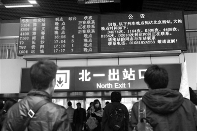 受10日以來石家莊暴雪影響,經(jīng)京廣線進(jìn)京的列車大面積晚點(diǎn)。昨天(11日),共有124趟進(jìn)出北京西站的列車晚點(diǎn),大量旅客的行程受到影響。為此,北京西站啟動應(yīng)急響應(yīng),開放全部候車大廳,旅客可選擇全額退票。 昨天下午4點(diǎn)多,記者在北京西站進(jìn)站大廳內(nèi)看到,顯示屏上有17趟從西站始發(fā)的列車顯示為晚點(diǎn),還有7趟列車未標(biāo)明發(fā)車時間。在屏幕下方,滾動字幕顯示晚點(diǎn)列車信息。各個候車室外均增加了鐵路工作人員,負(fù)責(zé)維持秩序并做解釋工作。
