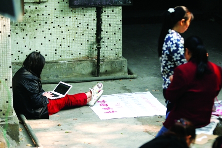 前日,網友“壞豬”在大渝網新聞報料吧上,以《史上最拉風 收廢品女》為名發(fā)帖報料!皦呢i”在帖子中稱,前日上午,他剛好從該居民樓前經過時,隱約看到樓梯口有一黑影,轉頭查看,眼前的景象將他雷得“外焦內嫩”:一身穿黑衣的女子,背靠墻壁席地而坐,身前放著一個寫有“專業(yè)回收”的廣告布,她對過往市民毫不理會,而是專心敲打放在其大腿上的筆記本電腦!拔疫從來沒看到過哪個收廢品的有這個女的這么潮!太拉風了噻”。