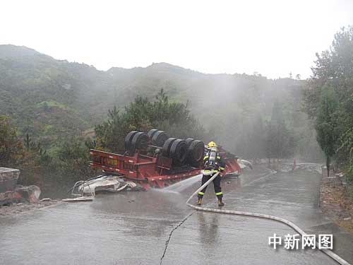 中新網(wǎng)溫州11月20日電(記者 江耘 通訊員 徐行號(hào))11月20日早晨6時(shí)許,浙江樂(lè)清市樂(lè)成鎮(zhèn)往白石鎮(zhèn)方向的盤(pán)山公路轉(zhuǎn)彎處一輛載有15噸的鹽酸的半掛車(chē)發(fā)生側(cè)翻泄漏事故。