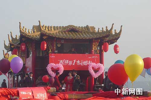 遲來(lái)的婚禮將讓姚春曉和新娘終身難忘。今天的水上婚禮在一條浪漫的畫(huà)舫上進(jìn)行,畫(huà)舫的周?chē)簇?fù)碇?00艘掛滿(mǎn)紅燈籠的劃船,儼然像是被紅綢包裹著的白堤。