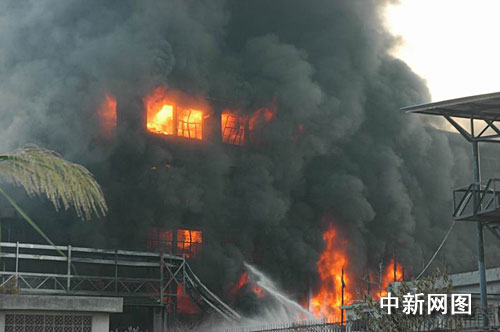 記者在現(xiàn)場看到火光沖天,滾滾濃煙躥起有兩百米高,方圓一公里內(nèi)可聞到陣陣焦味。離火災(zāi)現(xiàn)場數(shù)米之隔,則是茂名華粵勞保用品公司生產(chǎn)車間,工人正在緊急轉(zhuǎn)移物資,以防火災(zāi)蔓延。