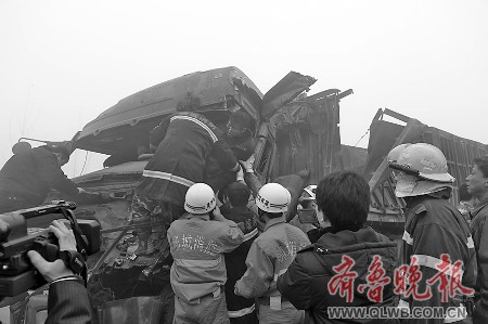 據(jù)消防隊(duì)員介紹,大霧致使京福高速公路上發(fā)生多起車禍,他們在現(xiàn)場共救出4人,其中2人死亡,2人受傷。