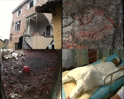 記者:“在這個事故現(xiàn)場,我們也可以看到這里已經(jīng)是一片狼藉,這個樓馬上已經(jīng)要塌陷了,這個地上到處布滿了炮筒,這些應(yīng)該是一盤已經(jīng)裝好火藥的煙花,這里我們看到滿地都是炮筒,這個房間正是布滿了整整一層的炮筒,在現(xiàn)場我們注意到有這樣一口鐘,我注意到時針指得是7點46分,也就是說這口鐘將永遠將定格在11月12日7點46分事故發(fā)生的那個時間!