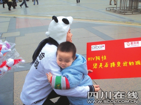 我是“艾滋病毒攜帶者”,能給我一個(gè)溫暖的擁抱嗎?昨日,一群打扮成熊貓模樣的年輕人舉著印有“您的擁抱能給我生存的勇氣”的紅色標(biāo)牌走在春熙路上,他們在擁擠的人群中穿梭,面帶微笑向路人致意。這些人的一舉一動(dòng)引起了市民強(qiáng)烈好奇,有的人干脆跟在這些年輕人身后看個(gè)究竟。