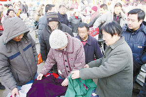 在一個(gè)小攤兒上,一位老大媽看上了一件毛衣,正在討價(jià)還價(jià),先前的兩個(gè)老人擠了上來(lái)。老漢擠住買(mǎi)毛衣的老大媽?zhuān)咸笫肿テ鹨患伦餮谧o(hù),右手伸進(jìn)了老大媽左側(cè)的口袋,把錢(qián)掏走了。