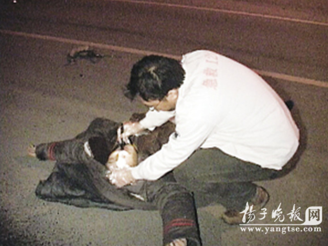 昨天凌晨0點(diǎn)35分,一輛由南向北行駛在南京揚(yáng)子江大道上的銀灰色速騰轎車,在開到定淮門大街的路口時(shí),突然將一名騎助力車身著保安制服的男子撞飛40多米外的車道上。頓時(shí)被撞保安不省人事。事情發(fā)生后,110民警接到報(bào)警立即通知了120救護(hù)車及交警五大隊(duì)到場(chǎng)處理。很快,民警臨時(shí)用路障將現(xiàn)場(chǎng)進(jìn)行保護(hù),此時(shí),那名穿著保安制服的中年男子仰面倒在地上,這名保安是南京鼓樓區(qū)保安公司的保安萬德華。醫(yī)護(hù)人員將他抬上車就近送往南京醫(yī)科大學(xué)第二附屬醫(yī)院搶救。