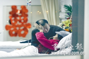 由于病痛折磨,蔣翠有些支撐不住,但她依然堅持坐著。張兵將蔣翠強行抱回病床,讓她躺著休息!皼]想到,這場婚禮晚了13年。”蔣翠說,自己1996年和丈夫結婚時,由于經濟拮據,并沒有舉行婚禮。不過,13年后,在她被病魔糾纏時,丈夫卻以這種形式完成了她的夢。