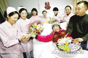女子叫蔣翠,今年38歲。男人叫張兵,今年44歲。張兵推著妻子,輪椅軋過紅地毯,迎著空中的花瓣,進入病房。“祝福你們,你們讓我們懂得了攜手到老的承諾!贬t(yī)生護士共同祝賀夫妻倆,希望他們“新婚”快樂?粗贾贸尚路康牟》浚Y翠哭出了聲音!跋M銈兡軋猿窒氯ィ鲪塾肋h。”武警總隊醫(yī)院醫(yī)務處主任向貴平擔當起了主婚人的職務,向夫妻頒發(fā)了結婚證。這張結婚證也傾注了醫(yī)院醫(yī)生護士的心血。通過和南岸區(qū)民政局聯系、溝通,婚姻登記處工作人員特地到病房,為蔣翠辦理了結婚證。