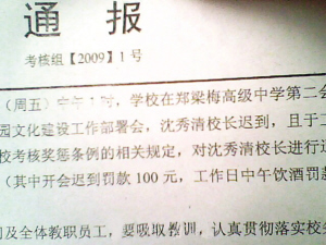 昨天上午,記者根據(jù)網(wǎng)友提供的地址打開(kāi)該網(wǎng)頁(yè)時(shí),發(fā)現(xiàn)了一篇題為《最猛校長(zhǎng)》的帖子,一則蓋有“鄭梁梅學(xué)校”公章的通報(bào)內(nèi)容稱:12月11日下午1時(shí),學(xué)校在鄭梁梅第二會(huì)議室組織召開(kāi)各學(xué)部校園文化建設(shè)工作部署會(huì),因校長(zhǎng)沈秀清遲到,且在工作日中午喝酒,所以根據(jù)學(xué)校獎(jiǎng)懲條例相關(guān)規(guī)定,對(duì)沈秀清校長(zhǎng)通報(bào)批評(píng)并罰款600元。在帖子里,記者發(fā)現(xiàn)600元罰款分兩種:開(kāi)會(huì)遲到罰款100元,工作日中午飲酒罰款500元。
