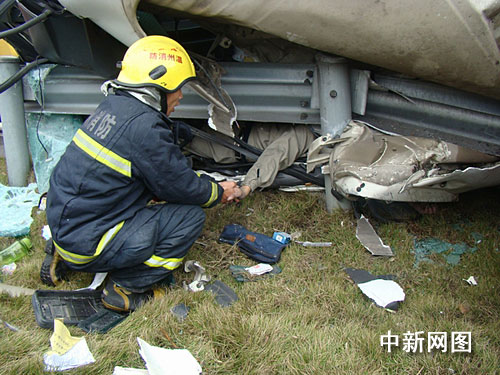 就在救援工作正一步一步緊張的展開時候,救援人員發(fā)現(xiàn),貨車油箱漏油十分嚴重,若不及時處置,遇到破拆的火星后果不堪設想,指揮員當即命令使用壓縮空氣泡沫槍,在救援現(xiàn)場有油污的地方附上一層泡沫,防止二次災害的發(fā)生。經過消防官兵30分鐘的緊張施救,第一名被困駕駛員成功救出,送往醫(yī)院救治。11時許,另一名被困人員也被成功救出,但經現(xiàn)場醫(yī)生確定已經死亡。