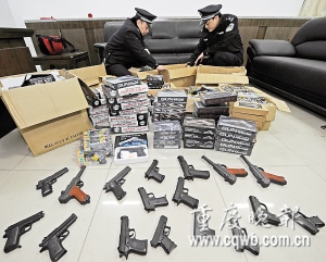 經查,高個男子叫奉華(化名),今年32歲,在遂寧做玩具生意。前段時間聽朋友說,重慶某縣市場有仿真槍出售,仿真度高,價格便宜,他于是打算進貨來遂寧賣。經多方聯(lián)系,奉華與重慶商家接上了頭。1月19日15時許,他與舅子蔣某(矮個男子)開車從遂寧前往重慶某縣,以4420元購買了382支仿真手槍后,準備運回遂寧,不想剛走到潼南,就被警方擋獲。