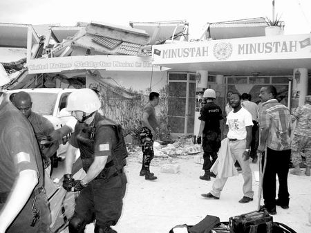 海地時間1月12日下午4時50分,太子港發(fā)生地震時,于江樺和在太子港工作的中國同事劉昆開車前往聯(lián)海團(tuán)總部大樓接一位美國同事。車子在大樓前還沒停穩(wěn),大家就覺得車子在晃,一樓已經(jīng)冒出大量白色灰塵并伴隨著轟鳴聲,于江樺和劉昆下車后趕緊向遠(yuǎn)離大樓的地方跑。由于地面在震顫,根本無法站立,倆人只好蹲下等地震停止。大約30秒鐘后,于江樺和劉昆轉(zhuǎn)過頭來,看到聯(lián)海團(tuán)總部大樓已經(jīng)完全坍塌。于江樺連忙掏出手機撥打隊長趙化宇的手機,但此時信號已經(jīng)中斷。這時防暴隊長說:“我們的代表團(tuán)正在樓里開會!甭牭竭@個消息后,于江樺的頭一下子就蒙了。