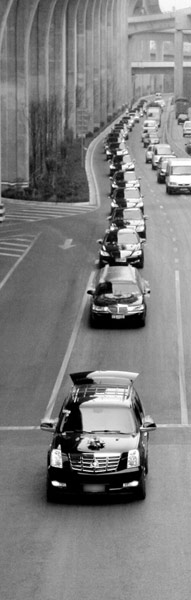 加長林肯開道,后面緊跟著20余輛保時(shí)捷卡宴、奔馳、寶馬;用于婚禮拍攝的則是一輛凱迪拉克越野車……這個(gè)超豪華的婚禮車隊(duì)昨天浩浩蕩蕩地出現(xiàn)在穿金路上,綿延數(shù)百米。如此壯觀的場(chǎng)景,吸引了不少路人羨慕的目光。